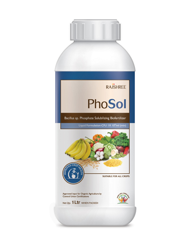 PHOSOL contains the phosphate solubilizing bacterium Bacillus sp., which, on reaching the soil gets activated and produces fresh batches of active cells. During their growth, they secrete organic acids that solubilize the fixed phosphorus in the soil and make it available to the plant in a usable form. This product is suitable for all crops.